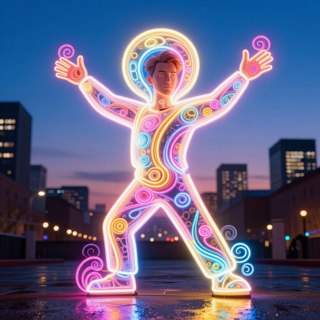 Neon-lit, swirling figure of a dancing man with outstretched arms, illuminated against a twilight cityscape with skyscrapers in the background