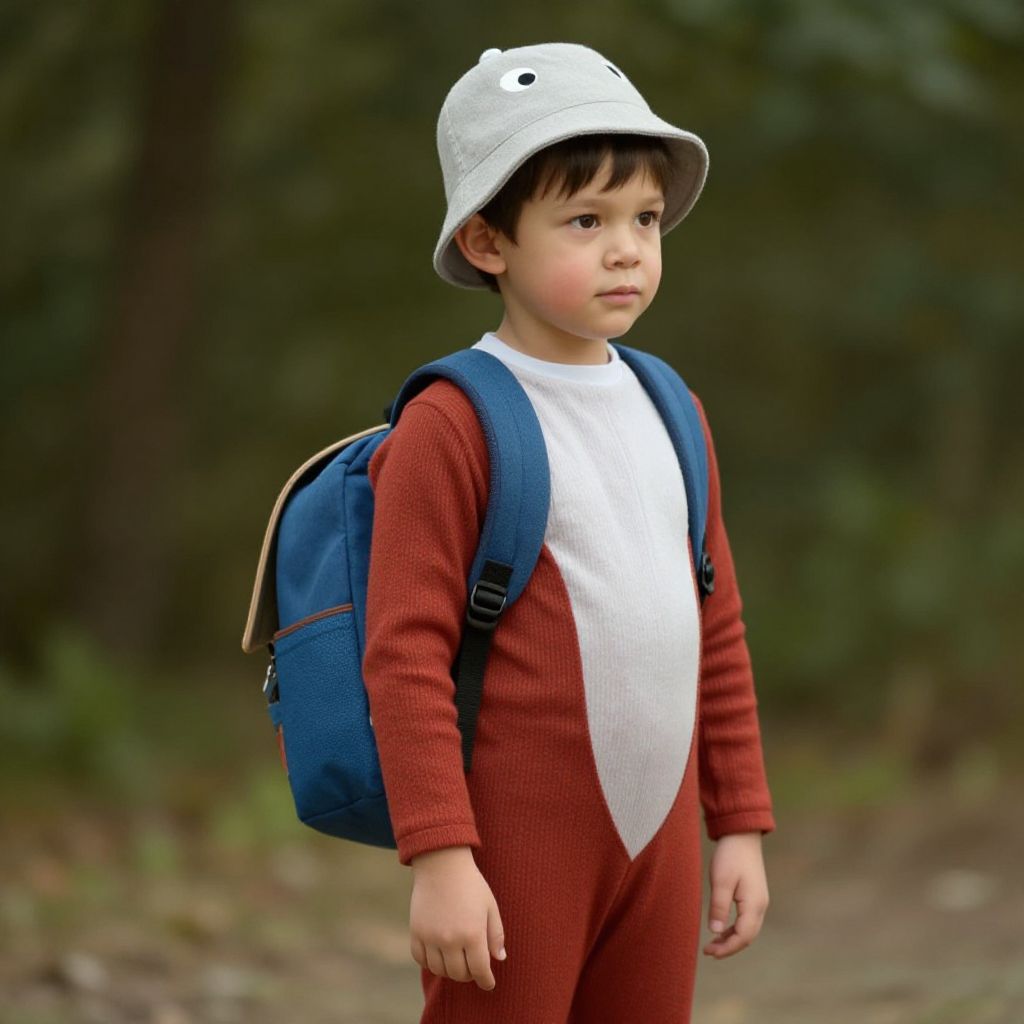 Ted From Curious George Costume, young boy wearing a hat and a backpack