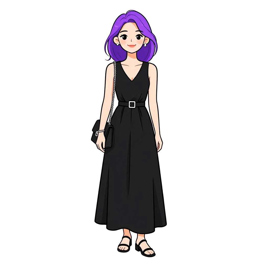 This digital illustration features a young woman with long, vibrant purple hair and fair skin, standing against a white background. She wears a light gray, long-sleeved, high-neck dress with a fitted waist and a flared skirt. Her dress has a subtle textured pattern. She carries a small, woven brown handbag with a black strap over her right shoulder. She has large, expressive black eyes, a small nose, and a gentle smile. The overall style is reminiscent of anime or manga, characterized by bold colors and clean lines. The image is simple and focuses entirely on the subject without any background details.