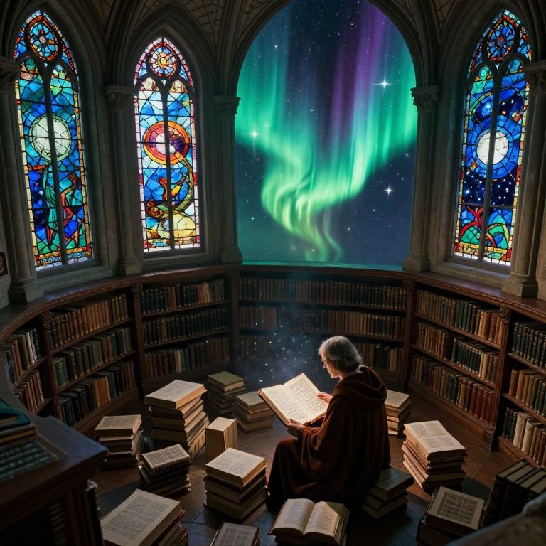 Elderly person in dark robe reads in library, surrounded by books, under vibrant green aurora displayed through colorful stained glass windows.