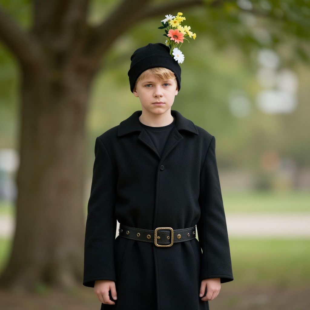 Photograph of a young boy standing outdoors in a park. He has light blonde hair and fair skin, wearing a black coat with a black belt and a black beanie hat adorned with colorful artificial flowers. The background is blurred, featuring a large tree and green grass, suggesting a natural setting. The boy's expression is neutral, and the lighting is natural, highlighting the contrast between his dark clothing and the greenery around him. The overall style is simple and focused on the subject.