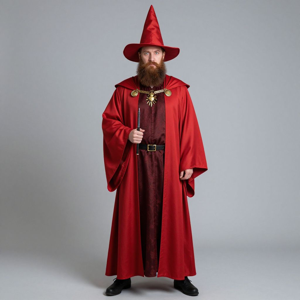 "Wizard Costume Original, bearded man in a red hat and red robe"