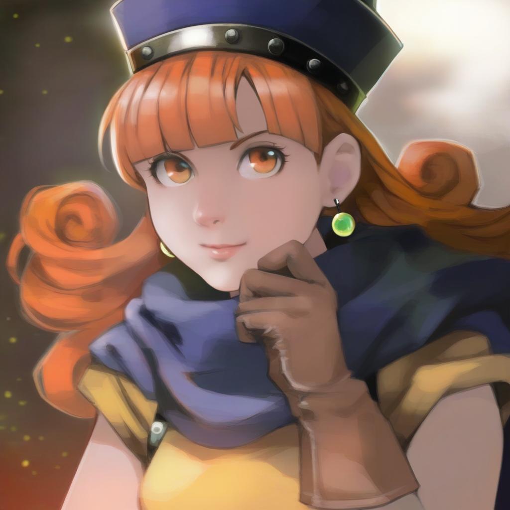 Alena (dq4), dragon quest, 1girl, red eyes, long hair, orange hair, curly hair, hat, cape, gloves, earrings, by artist kyuuba melo, leet
