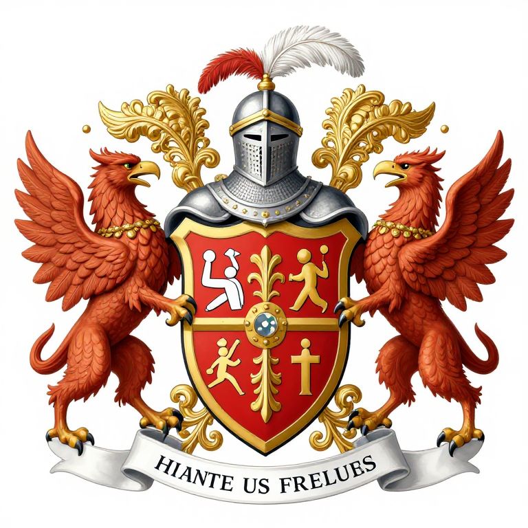 Paint a vibrant scene to create your own coat of arms featuring a shield adorned with symbols of strength and honor, flanked by mythical beasts like griffins, topped with a knight’s helmet and feathered plume, surrounded by intricate gold filigree, and a custom motto inscribed on a ribbon.