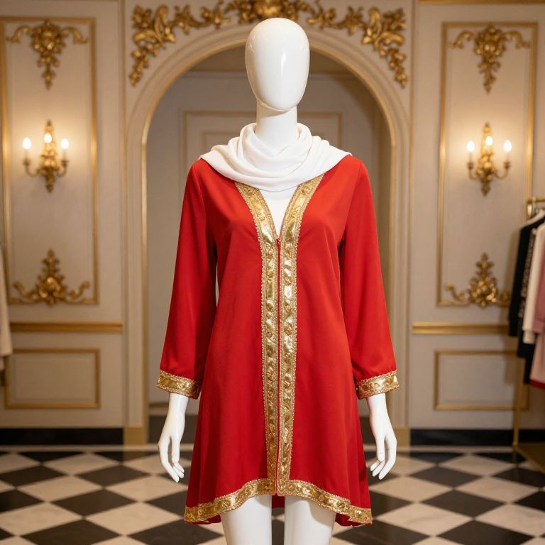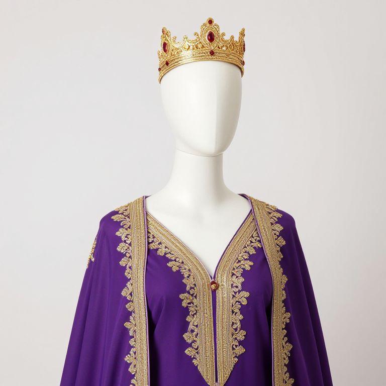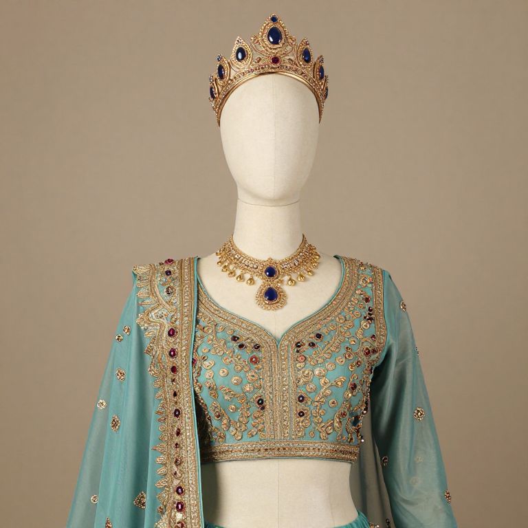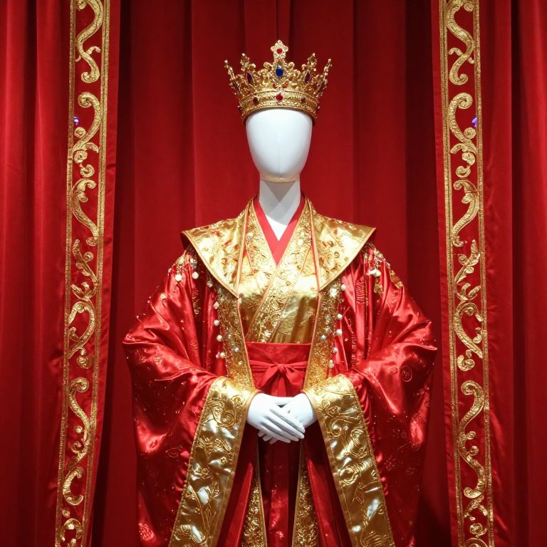 Mannequin wearing a blue dress with gold embroidery and a crown on his head. He is standing in front of a temple with red pillars and a gold statue in the background.