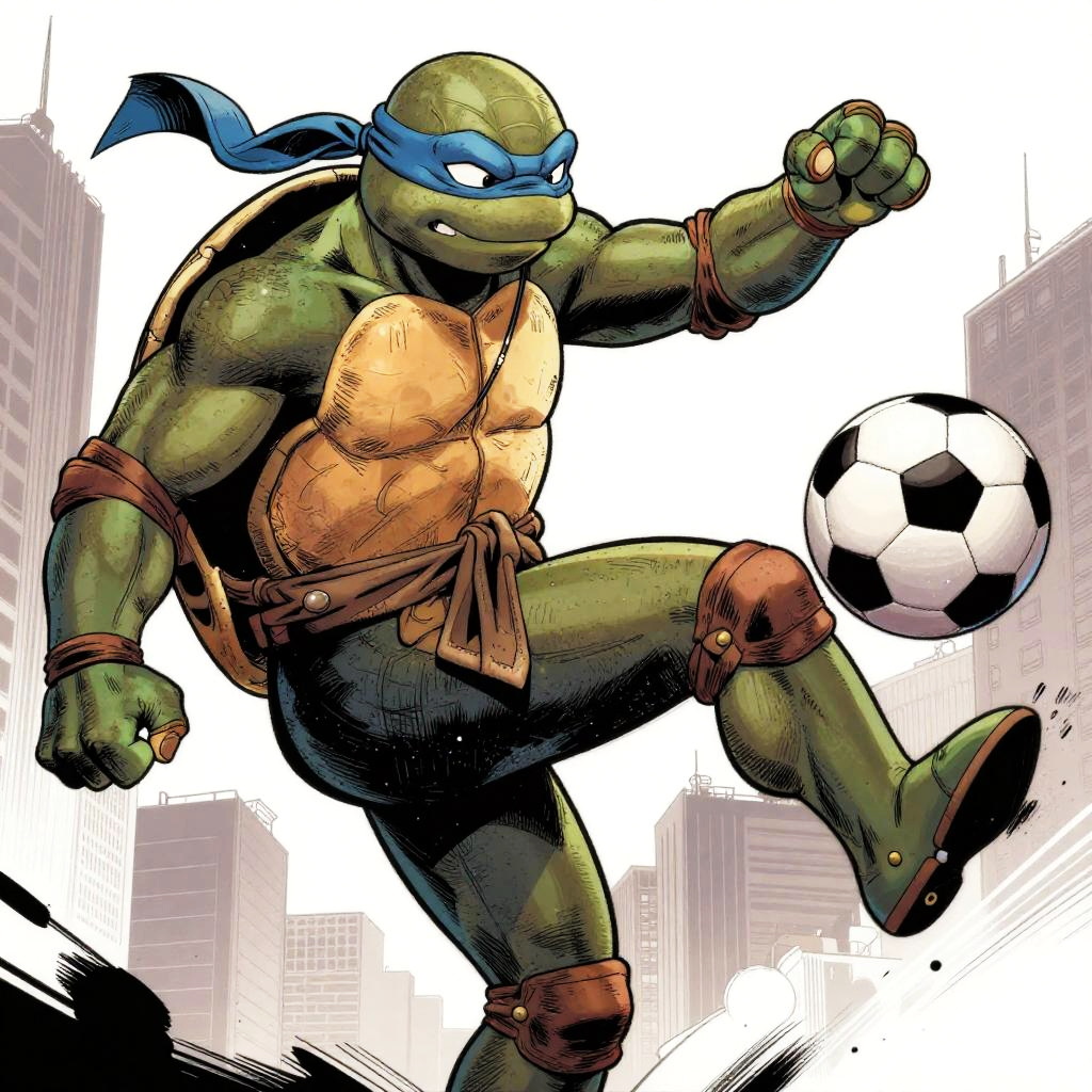 Mbappe TMNT crossover, heroic stance of Mbappe dressed as a Ninja Turtle, glowing eyes, sporty turtle shell with soccer elements, dark alley atmosphere, vivid illustration