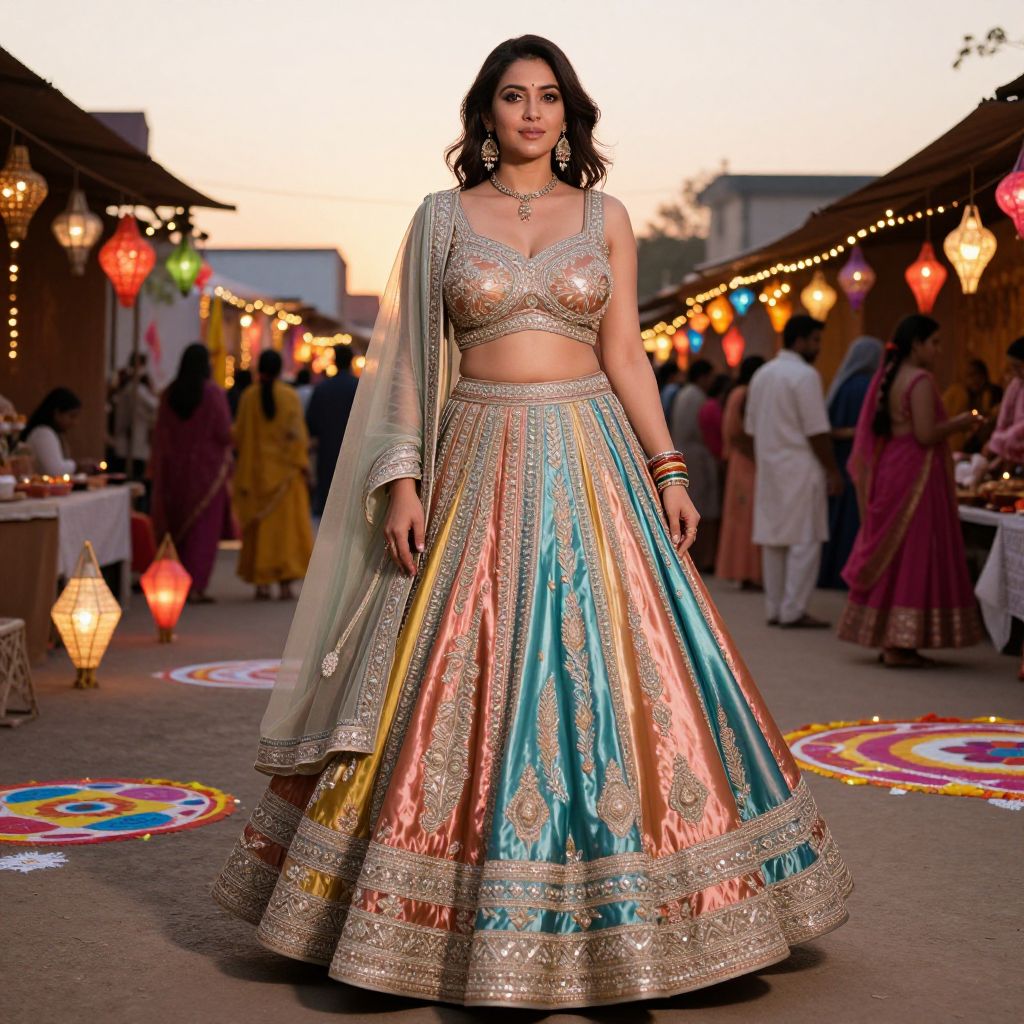 A vibrant, mid-30s Indian woman with dark brown hair, a fair complexion, and sharp cheekbones dons a magnificent fancy satin lehenga costume complete with silver-threaded work and a high, flared skirt. She is positioned in a festive marketplace during Diwali, surrounded by colorful lanterns, rangoli patterns, and women in traditional attire, her silhouette catching the golden hour sunset.. The woman has big tits and cute face
