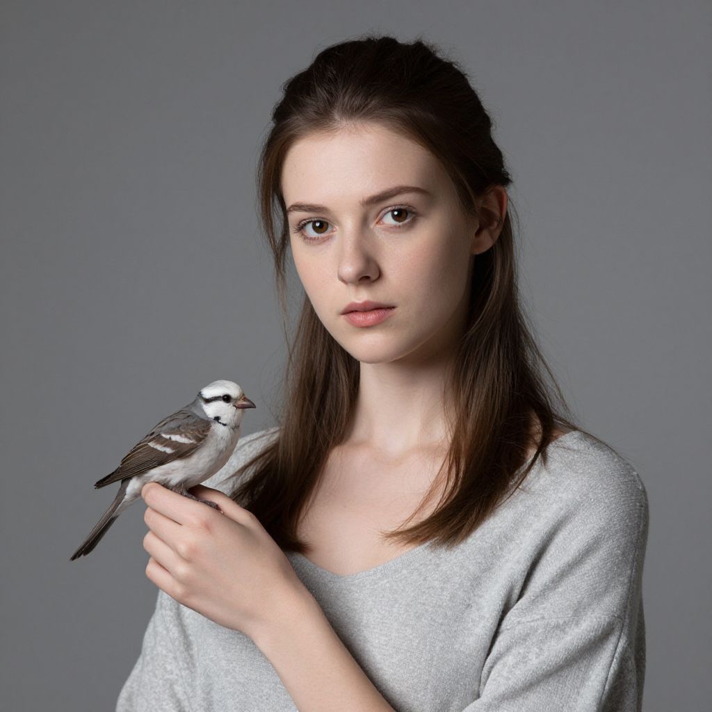 Photograph of a young Caucasian woman with fair skin and brown hair tied back, wearing a light blue, short-sleeved, button-up dress with a square neckline. She has a neutral expression and large, dark brown eyes. A small, white seagull with black wingtips and a yellow beak is perched on her right shoulder. The background is a solid, muted gray, creating a simple, studio-like setting. The lighting is soft, highlighting her face and the seagull, adding subtle shadows for depth. The image has a realistic, portrait-style aesthetic.