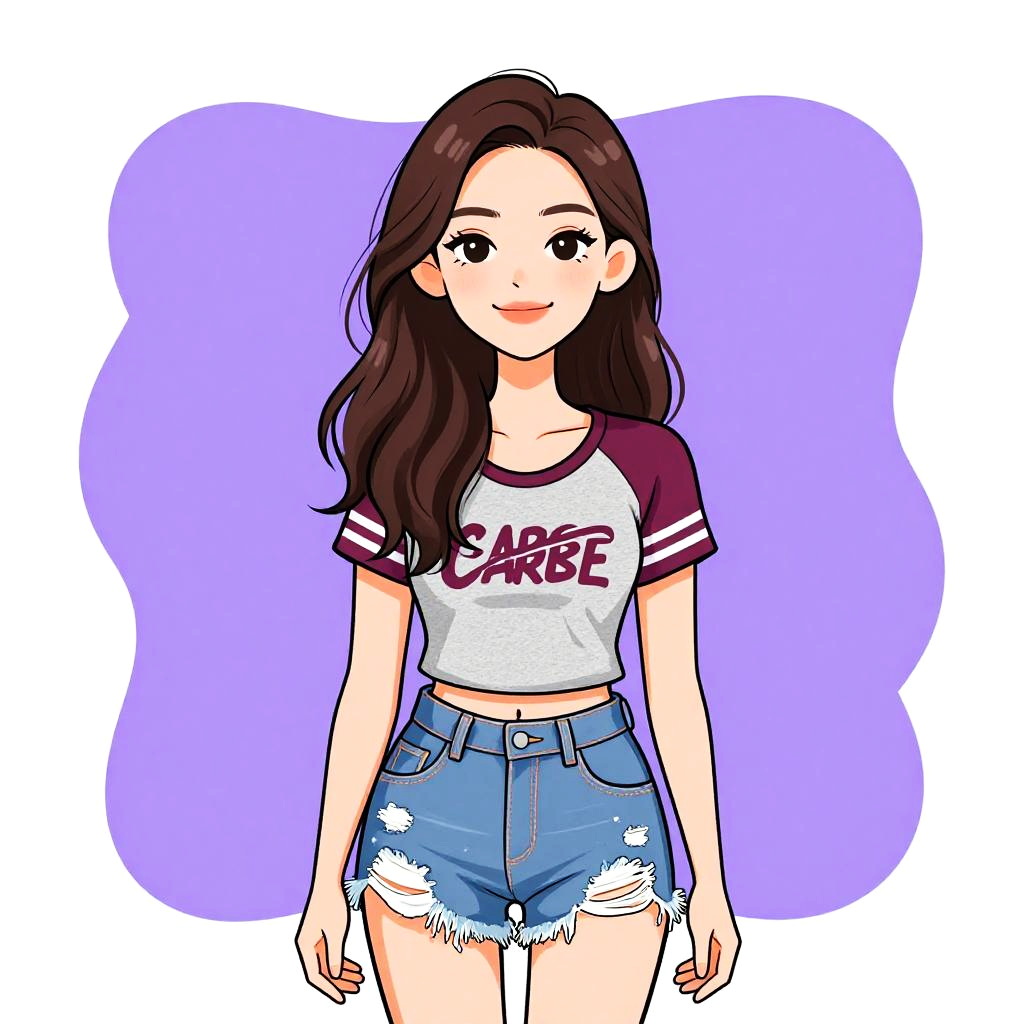 Digital anime-style drawing of a young woman with long, wavy brown hair and fair skin. She has large, expressive black eyes and a small smile. She wears a white crop top with maroon sleeves and the word "LAQUE" in red letters, paired with high-waisted, frayed denim shorts. The background is a simple, solid lavender color with a white border. Her posture is relaxed, standing with her arms slightly away from her body. The art style is vibrant and colorful, with clean lines and a slightly cartoonish appearance.