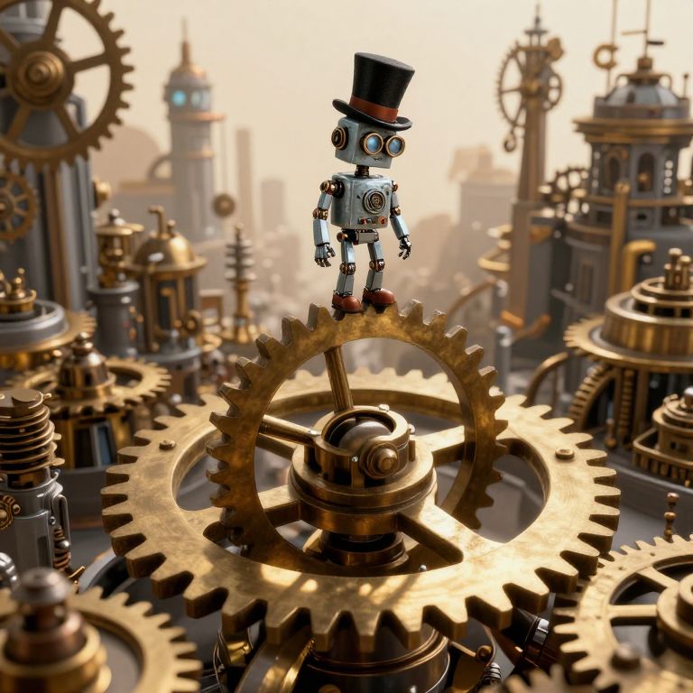 In a surreal surrealist scene, envision a whimsical landscape reminiscent of a steampunk wonderland, where a diminutive robot stands atop an immense spinning gear. This sprawling mechanical metropolis is composed of intricate metalwork and gleaming brass gears, casting long shadows from the robot's presence. The tiny figure in its oversized top hat and monocle evokes a sense of awe and solitude as it navigates this vast machinery, contrasting the environment's industrial efficiency with the character's whimsical, human-like demeanor. This juxtaposition encourages contemplation on themes of life, purpose, and companionship within the context of advancing technology and innovation.