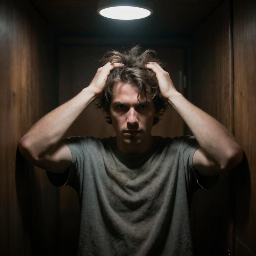 Man with disheveled brown hair, wearing a dirty gray shirt, slumped against dark wooden walls, hands in hair, intense expression. Dimly lit, claustrophobic setting, overhead light source.