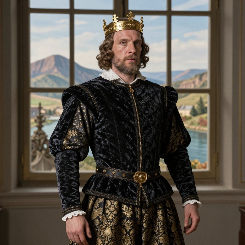 Photographic-style digital artwork of a middle-aged white man with curly brown hair and a beard, wearing a gold crown and an ornate black velvet gown with white lace cuffs and collar, belted at the waist. His expression is serious, and he stands in front of a large window with a scenic view of mountains, a lake, and greenery. The gown features intricate gold embroidery, and the background includes a blurred medieval-style castle. The image has a realistic, slightly dramatic lighting effect, emphasizing the historical and regal theme.