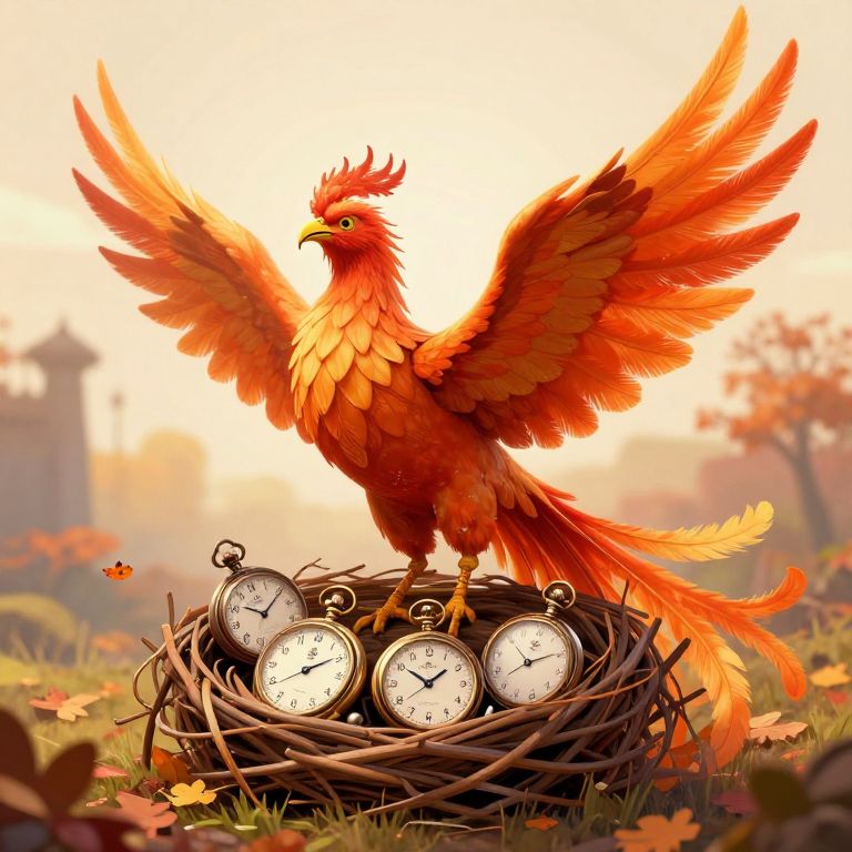 A phoenix, wearied by eternal cycles, builds a nest of broken watches in the hope of catching unclaimed time.