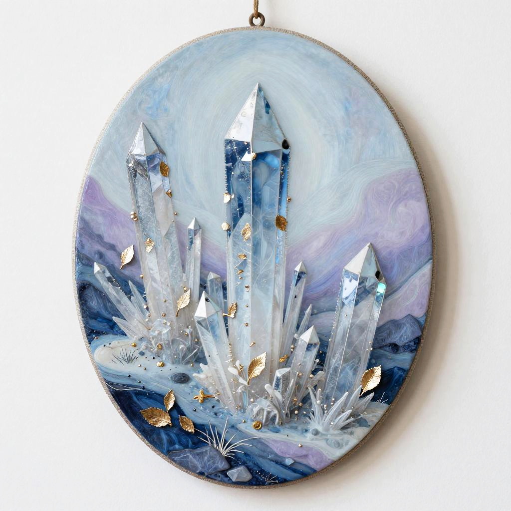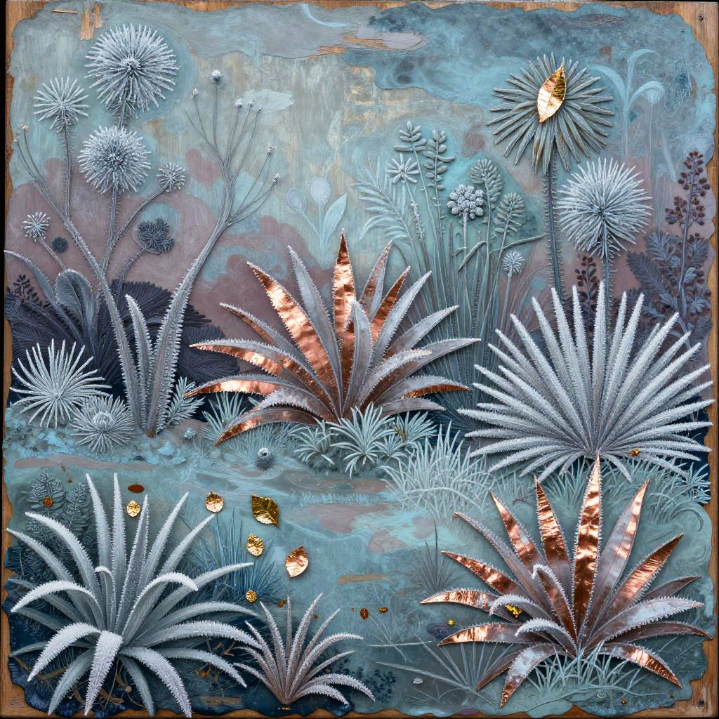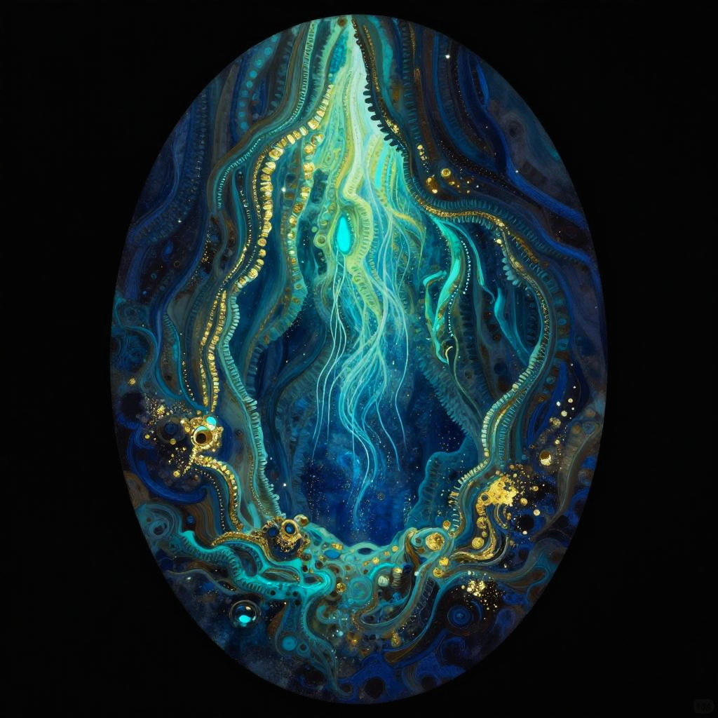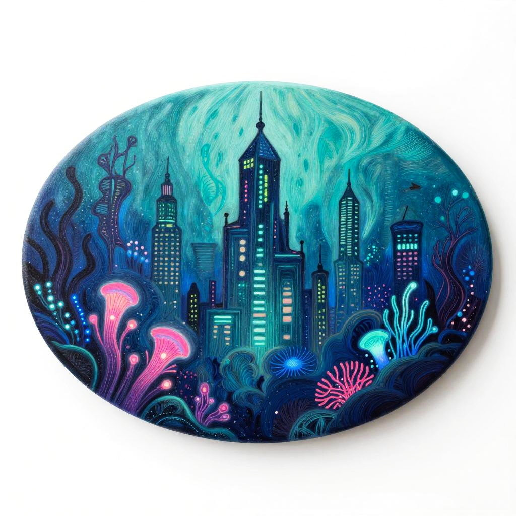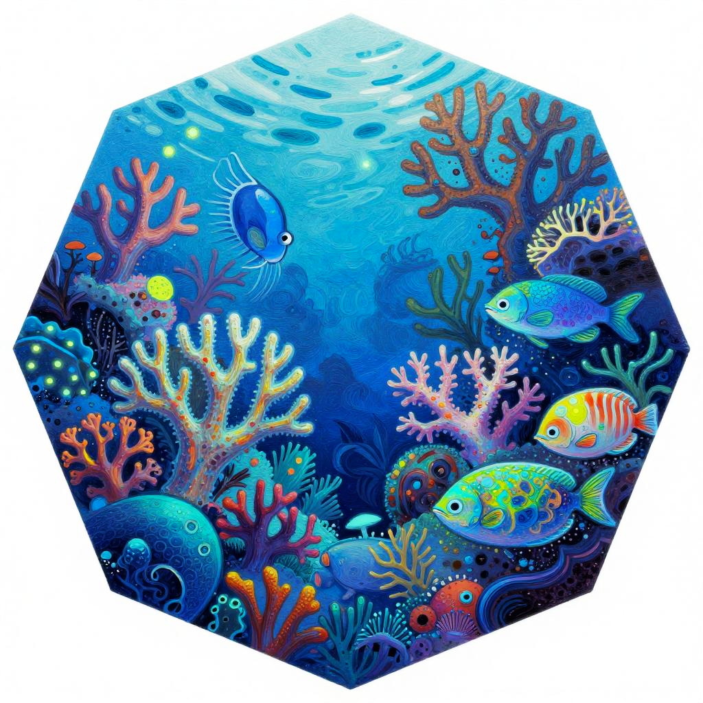A bioluminescent coral reef teeming with exotic sea life illustrated using gouache and ink on a textured hexagonal canvas. The color palette would be iridescent blues and teals with neon accents, creating a sense of tranquil and luminous. Techniques of layering and blending would enhance the overall composition.