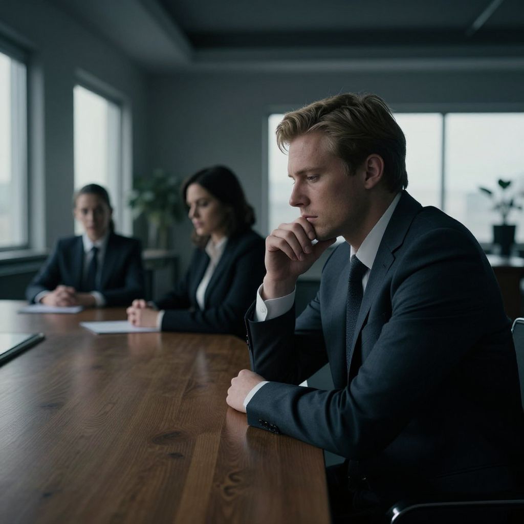 Photograph of a serious business meeting in a modern office. In the foreground, a Caucasian man with blonde hair, wearing a dark suit and tie, sits at a wooden table, resting his chin on his hand, looking contemplative. In the background, two other professionals, a man and a woman, both in dark business attire, sit with expressions of focus. The office has large windows with natural light, a potted plant, and a sleek, modern design. The overall color palette is dark and professional, with a cool blue tone.