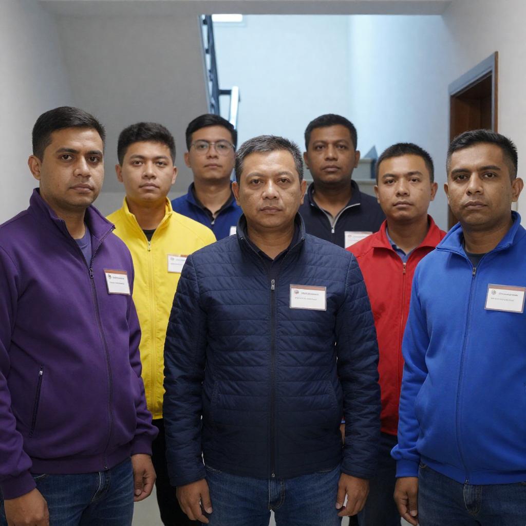 Photograph of seven men standing closely together in a brightly lit hallway. They wear colorful jackets in shades of purple, yellow, red, and blue. The central man in a blue quilted jacket has a name tag. Background includes a staircase and soft blue lighting. All men have serious expressions, and some have glasses.