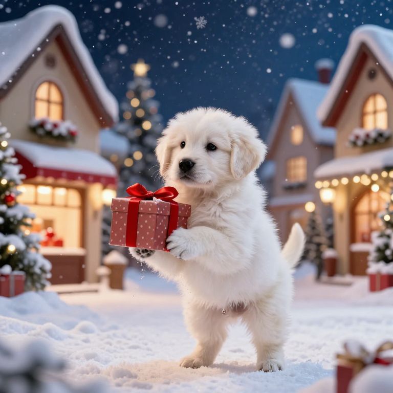 Photograph of an adorable, fluffy white puppy with black eyes, wearing a bright red knit beanie with a pom-pom and a matching red scarf. The puppy stands in a snowy outdoor setting, with blurred, snow-covered trees in the background. Snowflakes are visible in the air, and the sunlight creates a sparkling effect on the snow. The puppy's fur is soft and well-groomed, and its expression is cute and curious. The bright red accessories contrast sharply with the white snow and fur, making the puppy the focal point of the image.