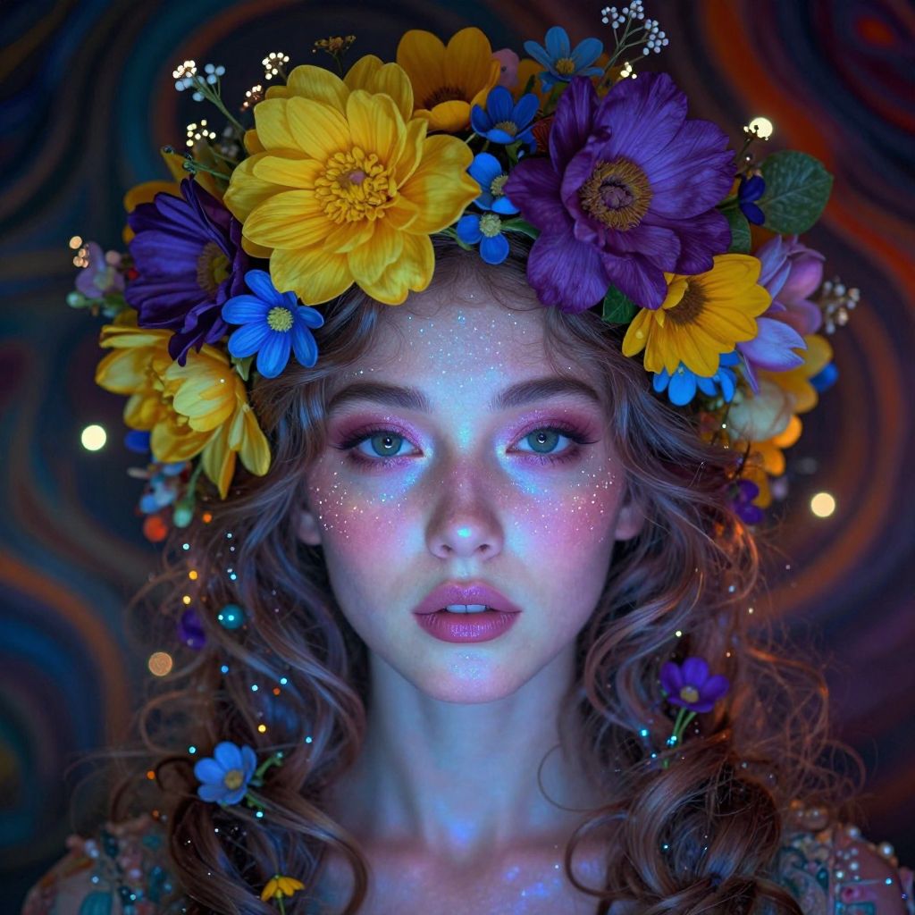A digital artwork of a woman with glowing blue eyes, intricate face paint, and a floral crown, set against a dark background.