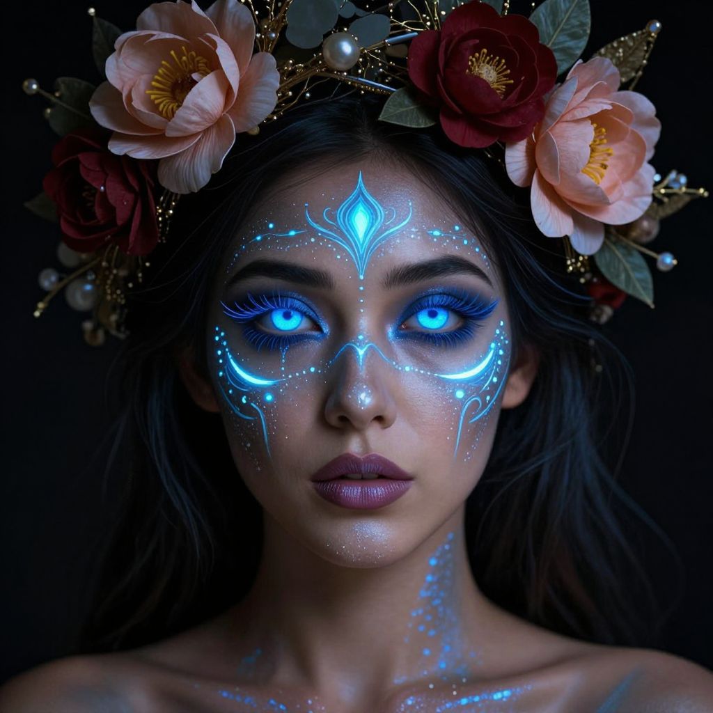 Photograph of a young woman with dark hair, wearing a floral crown of pink and red roses. Her face is adorned with glowing blue and white intricate tribal-style face paint, featuring a radiant blue eye design that mirrors her vividly glowing blue eyes. Her makeup includes dark, dramatic eyeliner and purple lipstick. The background is dark, making her illuminated face and floral crown stand out. Her skin has a subtle shimmer, adding to the ethereal effect. The overall style is reminiscent of fantasy or mystical themes, with a focus on glowing, otherworldly elements.