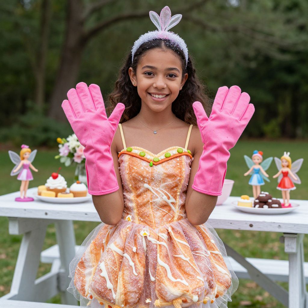 A cheerful teenager with warm brown skin and a friendly smile, dressed in a whimsical fairy bread costume complete with oversized pink frosting gloves and a glittery sugar-dusted headpiece, posing on a picnic table surrounded by toy fairy figurines and homemade treats