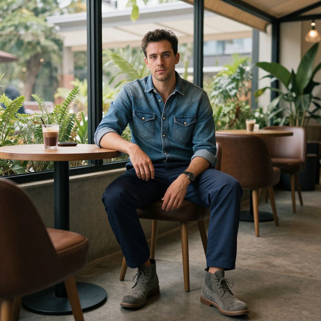 A man, faded denim shirt, navy chino pants, gray suede desert boots, modern aesthetic, cozy coffee corner, large windows, greenery-filled terrace, cri film style, relaxed expression, warm ambiance. Man has masculine face and piercing eyes