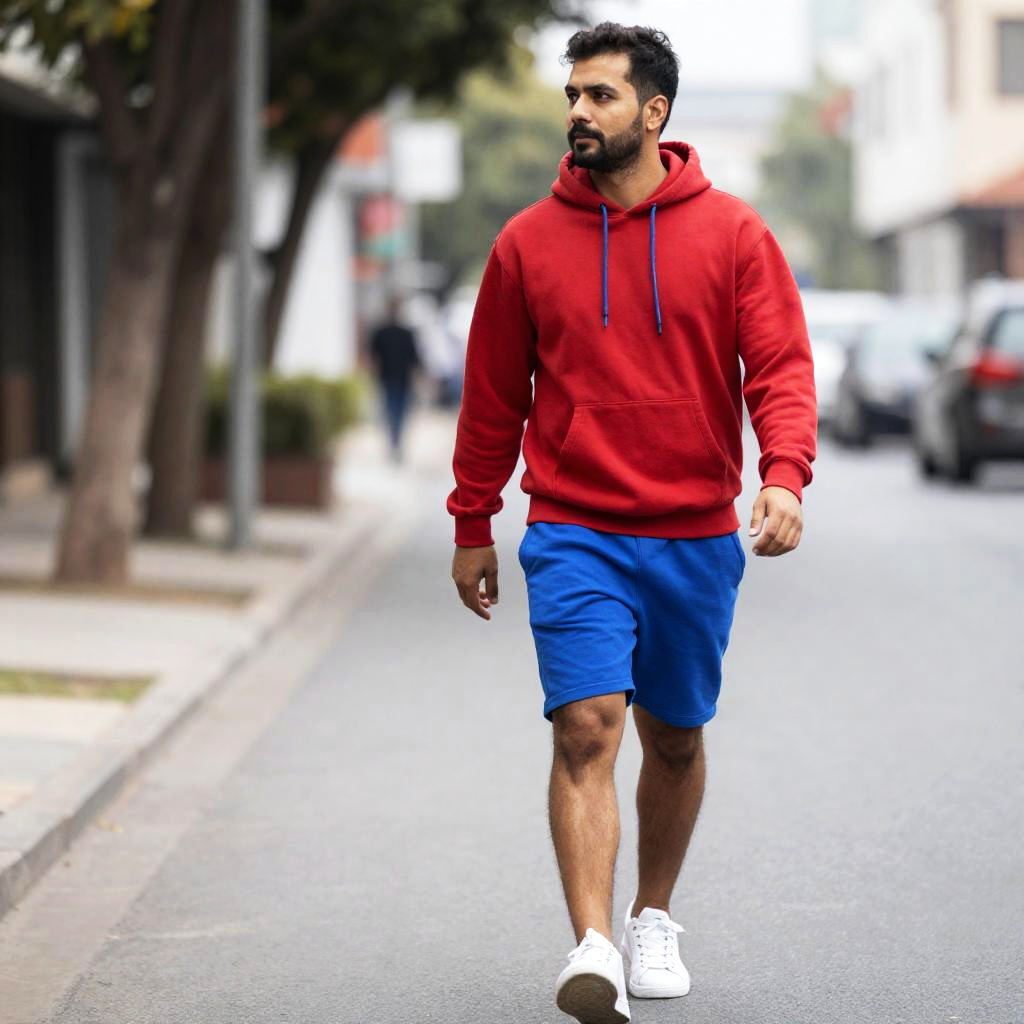 Athleisure Wear Man, man in a red and blue hoodie and shorts walking down a street
