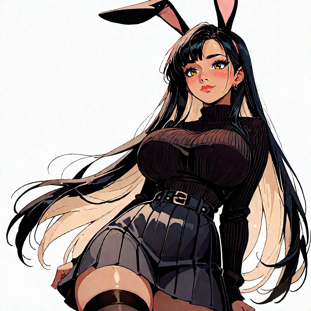 Digital anime-style drawing of a curvy woman with long black and white hair, black bunny ears, black turtleneck, high-waisted skirt
