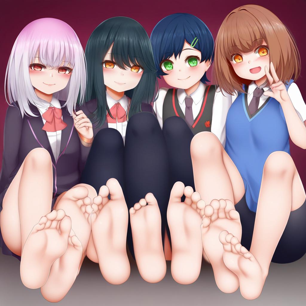 Asanaka yomogi, gridman universe, hair between eyes, orange eyes, yellow eyes, green eyes, blue hair, long hair, brown hair, short hair, feet, school uniform, toes, fingernails, by artist clarevoir, illustrious