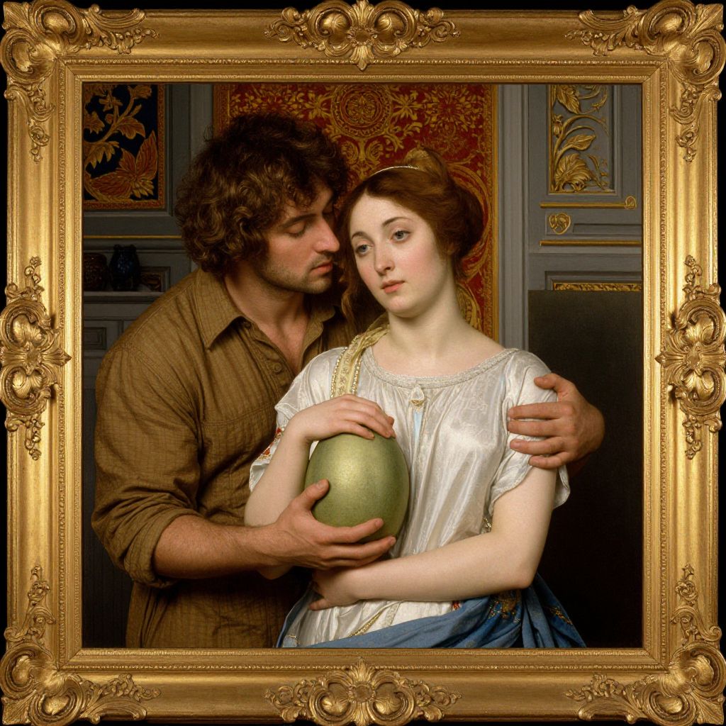 Classical painting of a young couple kissing, woman in white dress holding green orb, man in sleeveless gray shirt, ornate gold frame.