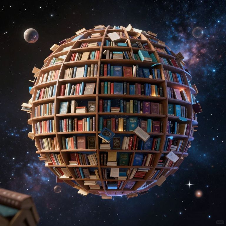 A surreal 3D-rendered scene depicts a massive, floating library in deep space, surrounded by celestial bodies and galaxies, where books transform into cosmic wonders, blending science fiction with fantasy in a high-definition, dreamlike visual narrative.