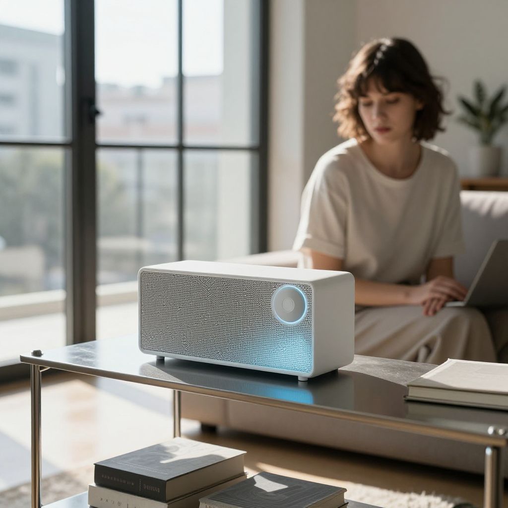 A modern minimalist radio on a sleek metal shelf in a contemporary apartment, glowing softly with a blue light, a young woman with short brown hair and focused eyes sitting on a cushioned sofa, sunlight streaming through large glass windows in the urban setting