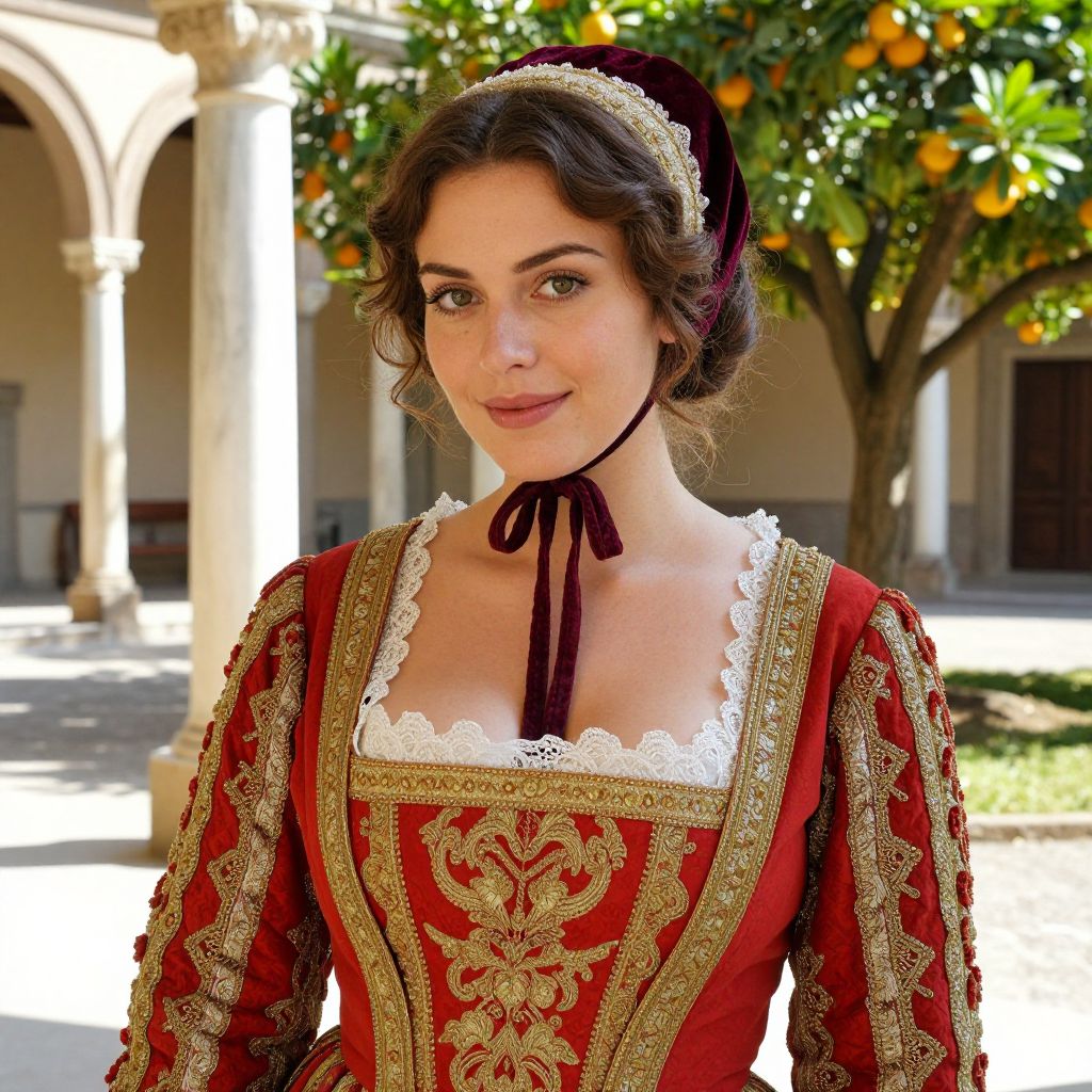 A realistic photograph of a woman in a vibrant Italian costume from the Renaissance period, wearing a red and gold embroidered dress, a lace collar, and a velvet bonnet, standing in a sun-drenched courtyard of a historic Florentine villa with orange trees and marble columns in the background, her face has warm, expressive eyes and gentle features with soft brown hair tied in a bun.. The woman has big tits and cute face