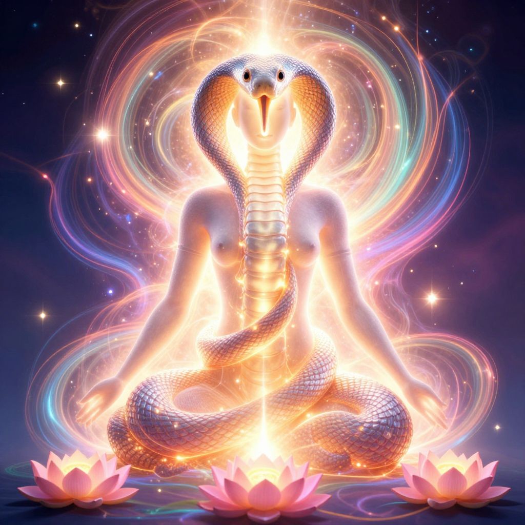 Digital artwork depicting a glowing, white, wireframe snake coiled in a double loop against a dark, star-filled background. The snake's luminescent outline forms a symmetrical, almost futuristic shape, with bright white light emanating from its center. The background features a subtle circular pattern with small, glowing text and stars, enhancing the sci-fi aesthetic. The snake's detailed wireframe structure contrasts sharply with the dark, cosmic backdrop, creating a striking, otherworldly visual effect.