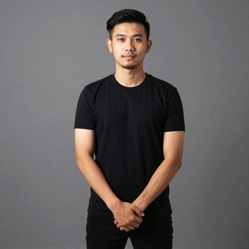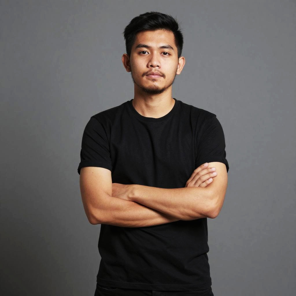 Photograph of an Asian man with short, black hair and a trimmed beard, standing against a plain, gray background. He is wearing a simple, black, short-sleeved t-shirt and has his arms crossed over his chest. His expression is neutral, with slightly furrowed brows and a slight, closed-mouth smile. The lighting is even, highlighting his medium brown skin tone and muscular build. The overall composition is minimalist, focusing on the subject without any distracting elements.