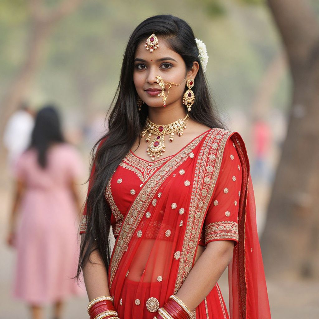 Photograph of a young Indian woman with long black hair, wearing a red traditional saree with gold embroidery, floral earrings, and a bindi,