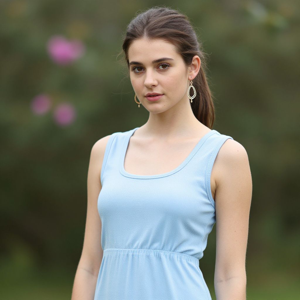 Photograph of a young woman with light olive skin and dark brown hair pulled back into a ponytail. She has dark brown eyes, subtle makeup, and is wearing a sleeveless, light blue dress with a simple, round neckline. Her ears are adorned with small, silver hoop earrings. The background is softly blurred with green foliage and a few pink flowers, creating a natural, outdoor setting. The woman stands facing the camera with a neutral expression, exuding a calm and composed demeanor. The lighting is natural, highlighting her clear complexion and the gentle texture of her dress.