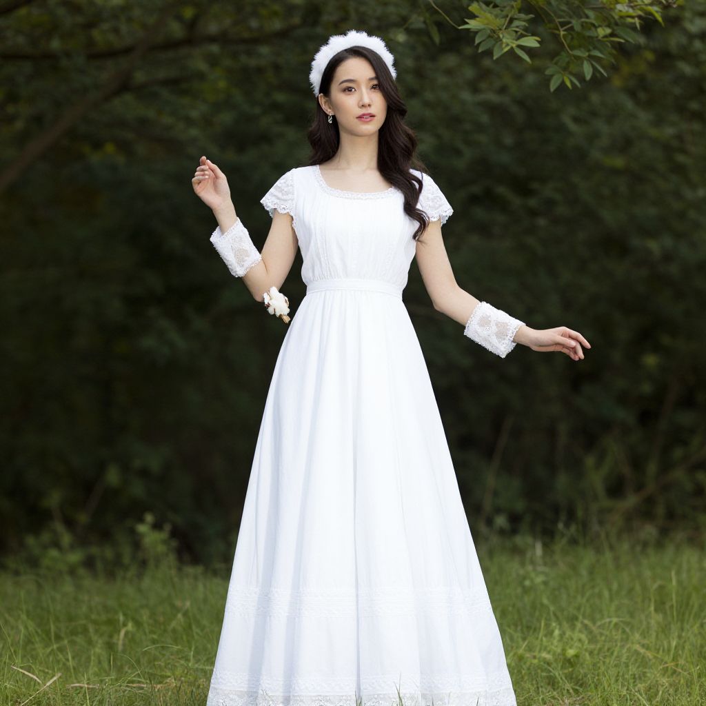 "Woman Cotton Clothing Costume, woman in white dress standing in front of trees"