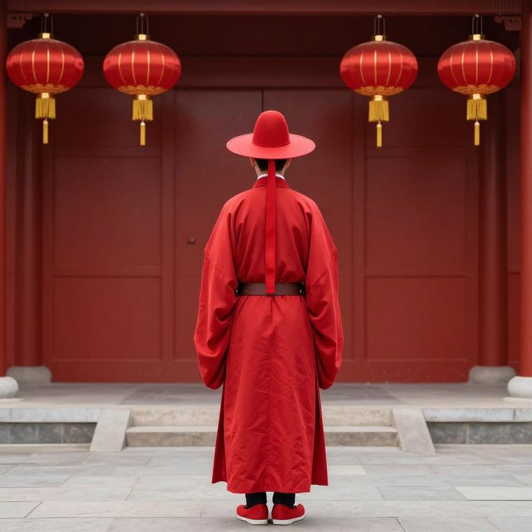 A person is wearing a red robe with a red hat and red shoes. The person is standing in front of a red building with red lanterns hanging from the ceiling.