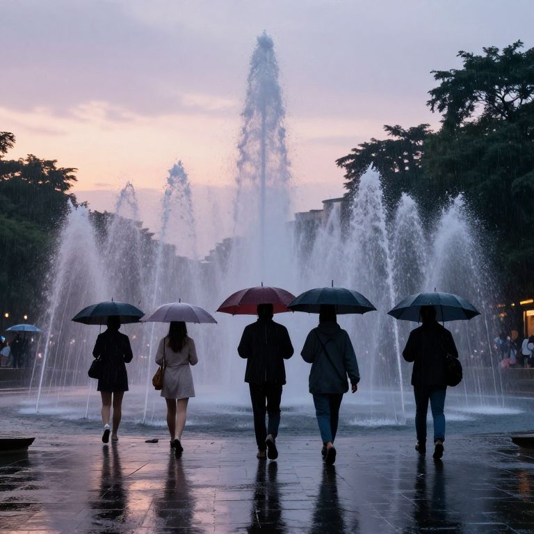 Raindrops fall upward during twilight, forming silent fountains of liquid memory that people walk beneath to remember forgotten dreams.