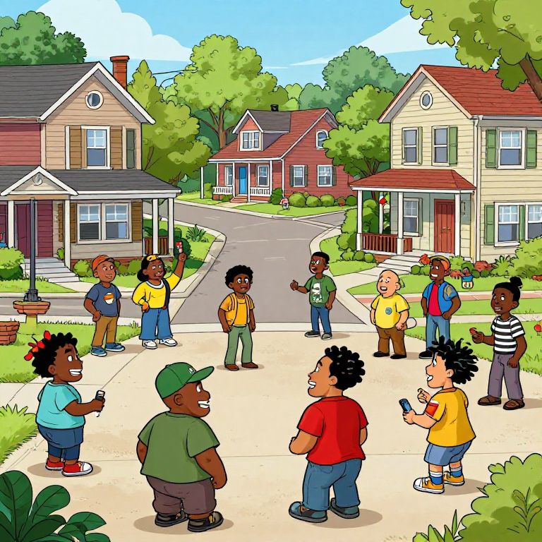 The boondocks pictures, a lively suburban neighborhood with animated characters having lively conversations, dark humor and cultural commentary portrayed through detailed, colorful comic illustration style