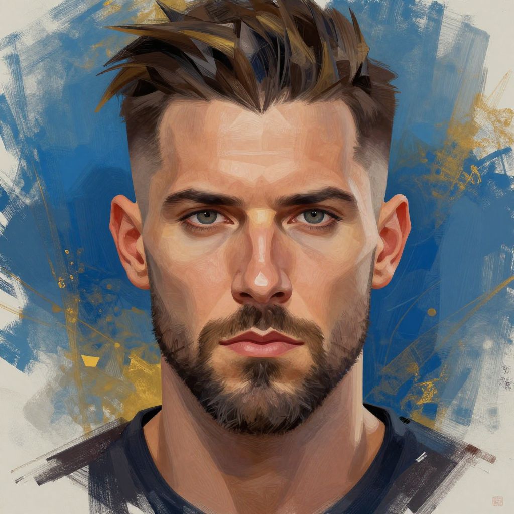 Digital portrait of a bearded, brown-haired, blue-eyed man with a serious expression, against a vibrant blue and yellow abstract background.