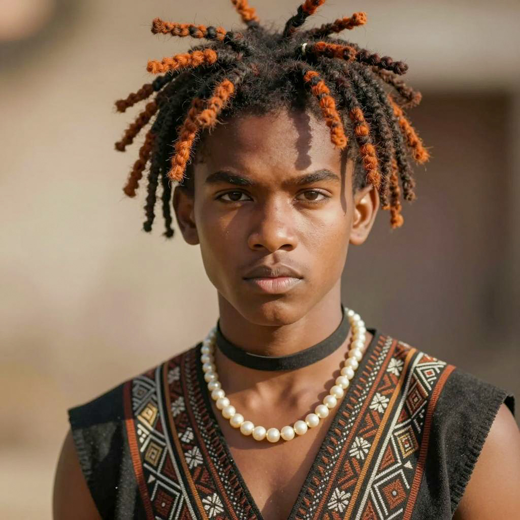 Exotic costume boy, photorealistic portrait of a young person with dark brown skin, intense expression, wearing a black choker, pearl necklace, sleeveless top with geometric and floral patterns, and a wild, spiky hairstyle with orange and black dreadlocks, soft warm lighting, blurred background, ethnic style, close-up, detailed ures, focused on face, natural light, cinematic, high contrast, strong shadows
