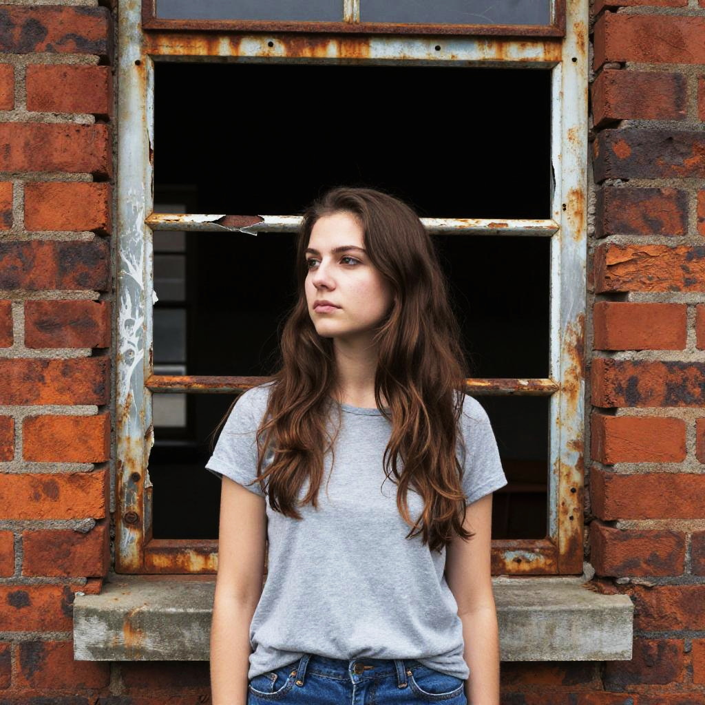 A young woman with long brown hair stands in front of a rusted, broken window frame set in a red brick wall. The natural lighting highlights her contemplative expression and the texture of her casual grey t-shirt, contrasting with the gritty, industrial background.