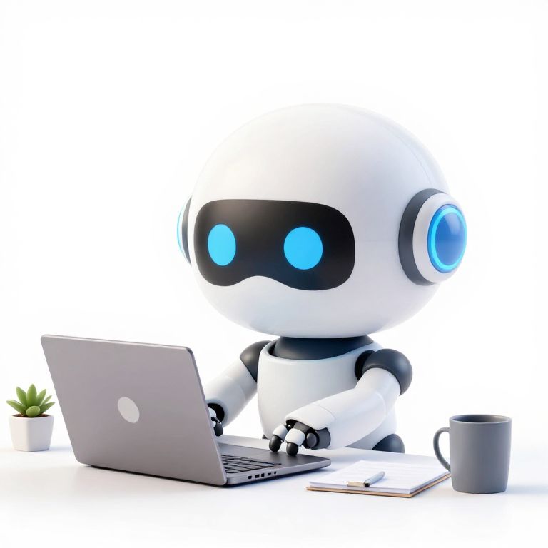 Fiber Art Super cute animation character, 3d rendering, photo realistic robot artist working with Laptop in the office desk, white clear clean background,