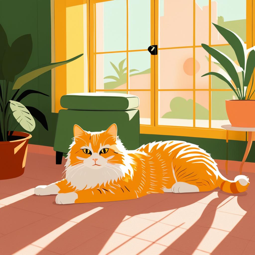 Digital illustration of an orange and white cat lying on a green and orange retro-style sofa near a large window with bright sunlight. The room features potted plants and warm tones creating a cozy, nostalgic atmosphere inspired by Wes Anderson's quirky style.