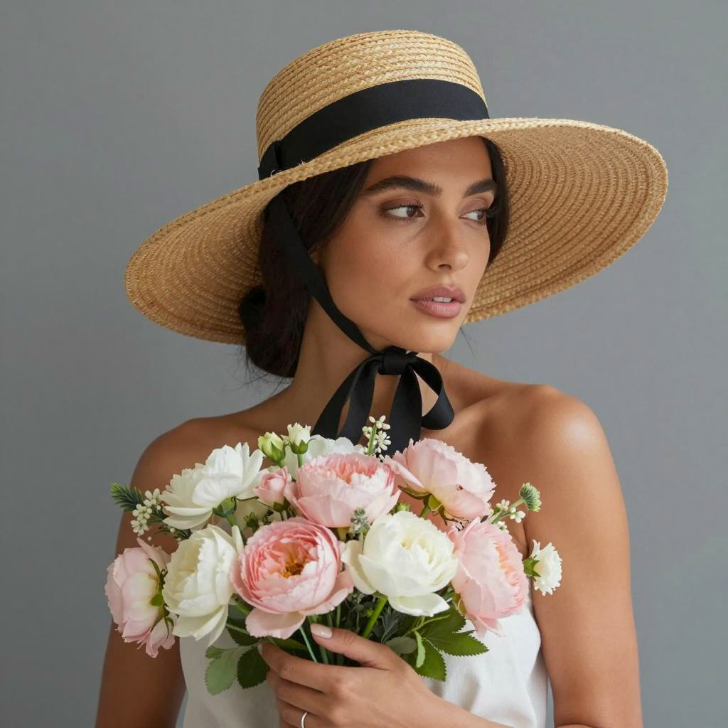 Portrait of a young woman with light brown skin and straight brown hair wearing a large pink sunhat, white strapless top, and white polka dot skirt. She smiles with an open mouth, holding a small bouquet of orange flowers in her right hand and her left hand near her mouth. The bright outdoor setting features white striped chairs and blue outdoor furniture in the background.