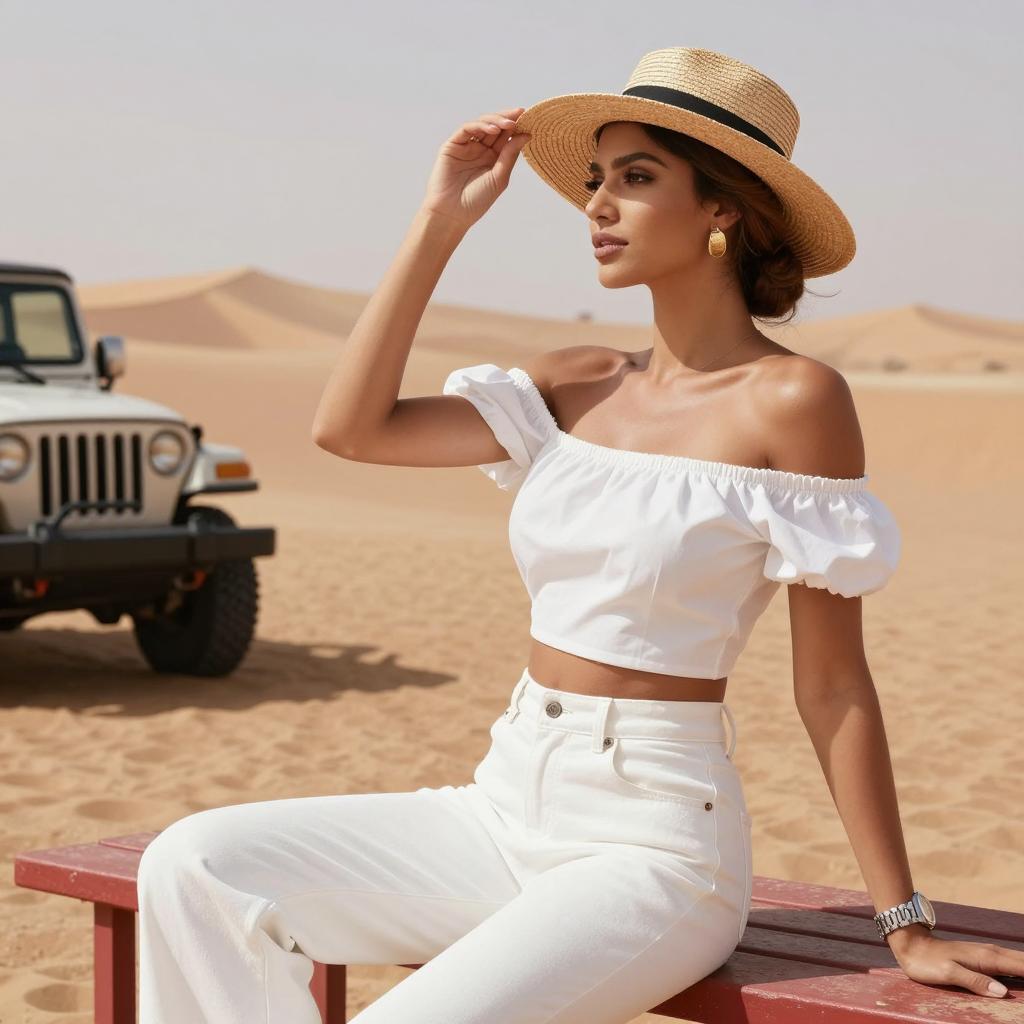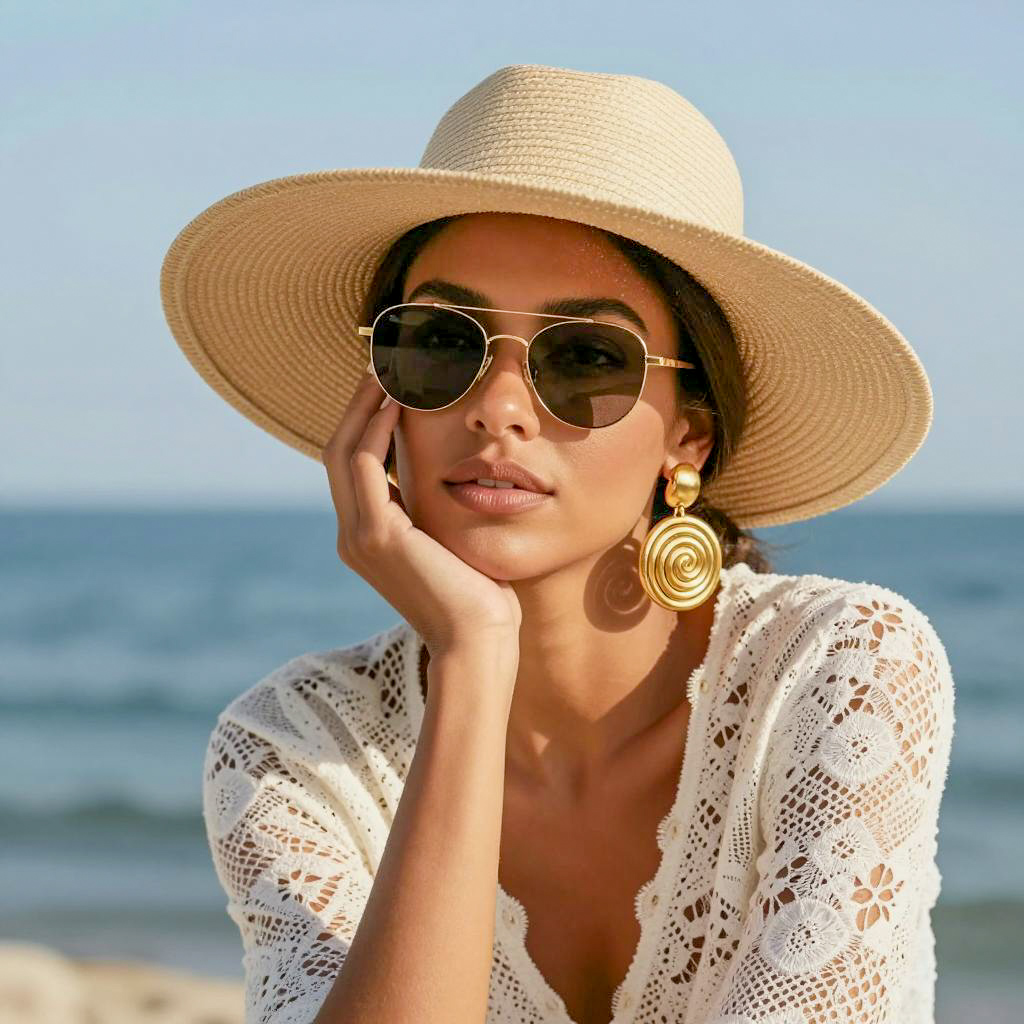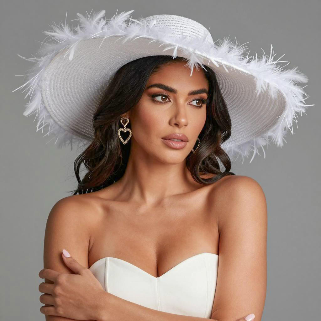 Woman with light brown skin and straight brown hair wearing a large pink sunhat, white strapless top, and white polka dot skirt. She holds a small bouquet of orange flowers in her right hand, her left hand near her mouth with an open-mouth smile. White striped chair in the background, blue outdoor furniture in the distance. Sunlight illuminates her face and hat. Earrings visible. Sitting position, slightly leaning forward. Bright, outdoor setting.