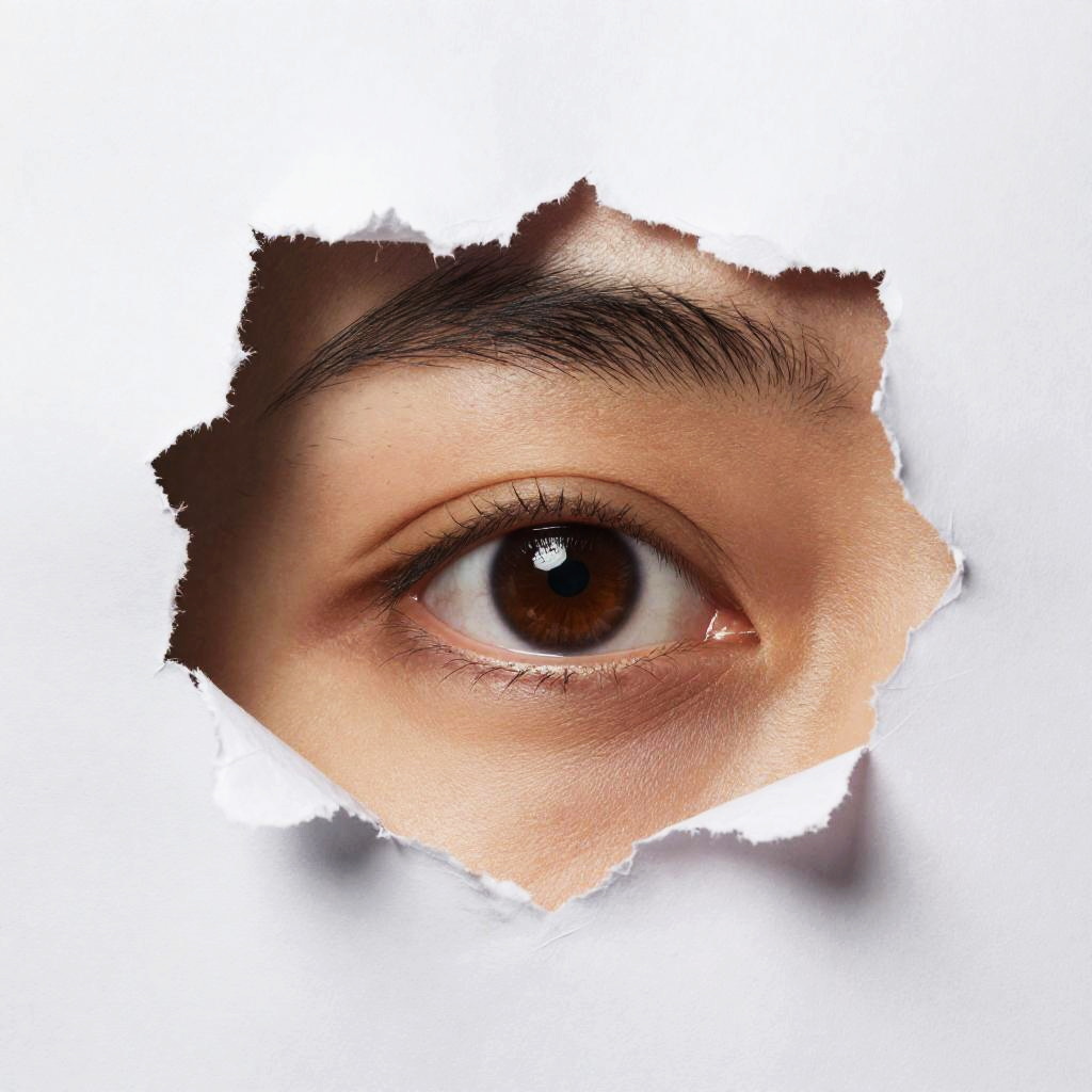 Photograph of a single, intense brown eye with a reflective shine, peering through a jagged tear in a white, paper-like background. The eye has thick, dark eyebrows and visible eyelashes, with subtle skin textures and natural light reflecting off its surface. The torn edges around the eye are irregular and slightly blurred, creating a sense of mystery and curiosity.