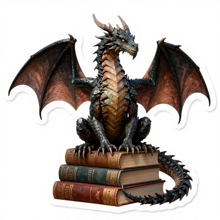 Transhumanist dragon sitting on a stack of books, in the style of Tolkien, sticker, white background,
