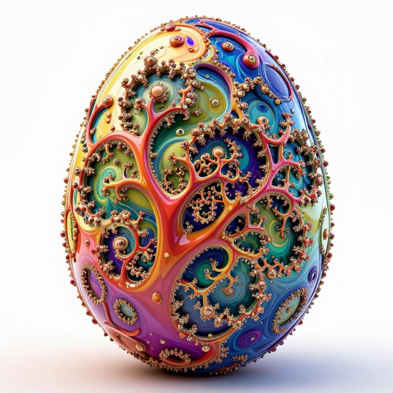 An intricately detailed, fractal, multi-dimensional organic structure resembling a Fabergé egg, with vibrant colors and branches of the Mandelbrot set.